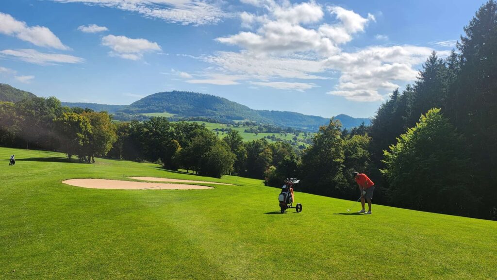 Was für ein Panorama! Blick von Loch 4 auf den Albtrauf. Foto 0711 GOLF CREW
