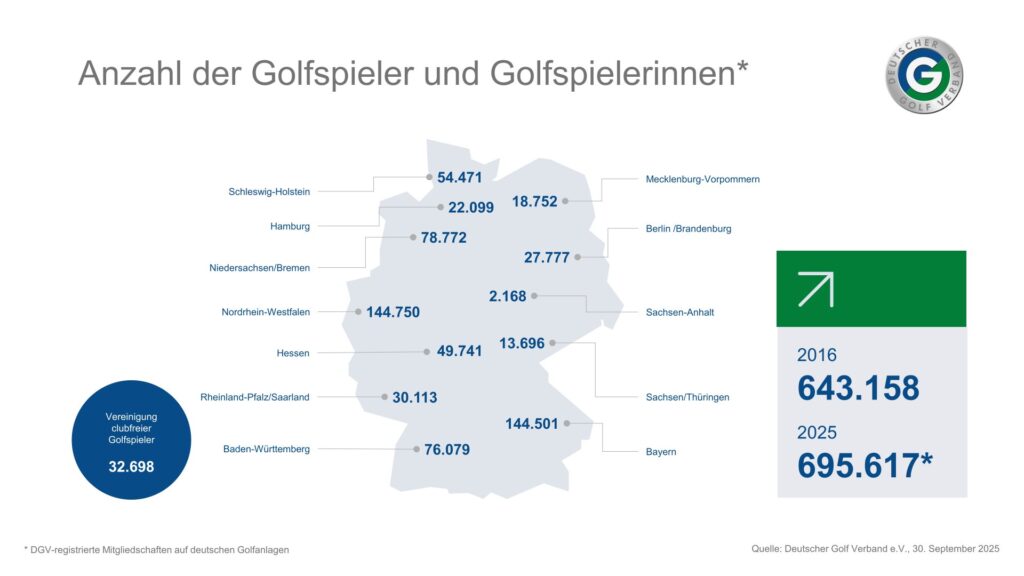 Zum Stichtag 30. September 2025 waren 695.617 Golfspielerinnen und Golfspieler in DGVangehörigen Golfanlagen registriert. Das entspricht einem Plus von 8.909 Mitgliedschaften und einem Wachstum von 1,3 Prozent gegenüber 2024. Damit hat sich dieWachstumsdynamik nahezu verdoppelt. „Golf in Deutschland weckt heute mehr Interesse