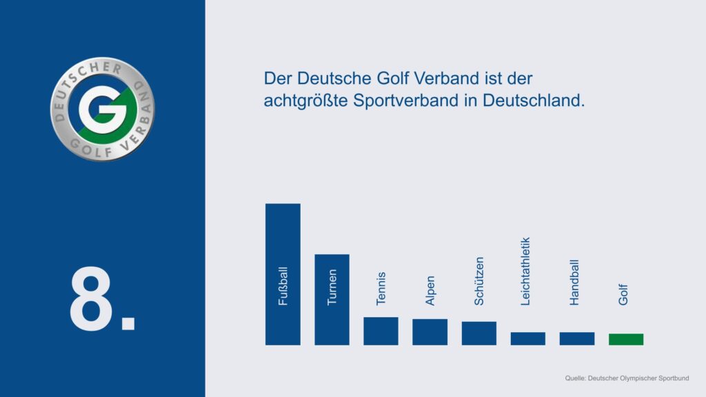Im Vergleich der großen Sportverbände behauptet Golf weiterhin seine starke Position: Laut DOSB-Statistik ist der DGV der achtgrößte Sportverband in Deutschland – vor der Reiterei und hinter Sportarten wie Fußball, Turnen und Tennis.Statistiken Deutscher Golf Verband 2025. (Grafik: DGV)